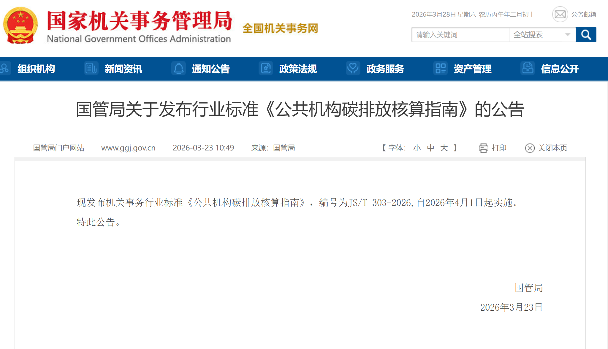 近日,国家机关事务管理局正式发布《公共机构碳排放核算指南》(JS/T303-2026),将于2026年4月1日实施。该标准填补了公共机构碳排放统一核算的规范空白,为党政机关、事业单位等摸清碳家底、推进绿色低碳转型提供权威依据。指南统一了核算规则与统计流程,让碳排放管理有规可循。