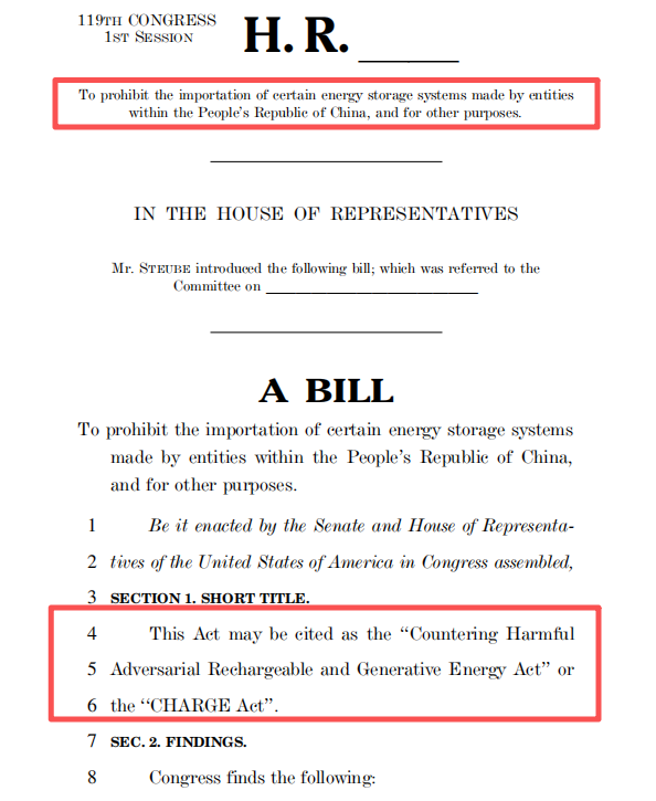 近日,美国方面拟出台相关立法,计划禁止部分中国储能系统进口。相关提案为《对抗有害敌对可充电与发电能源法案》(简称《充电法案》),核心内容为禁止进口包含中国企业拥有或许可技术制造的、具备远程监控能力的储能系统。提案方以电网安全为由推动该项禁令,法案还明确了违规处罚措施,故意违反禁令者将面临五年以下监禁或/和25万美元以下罚款。