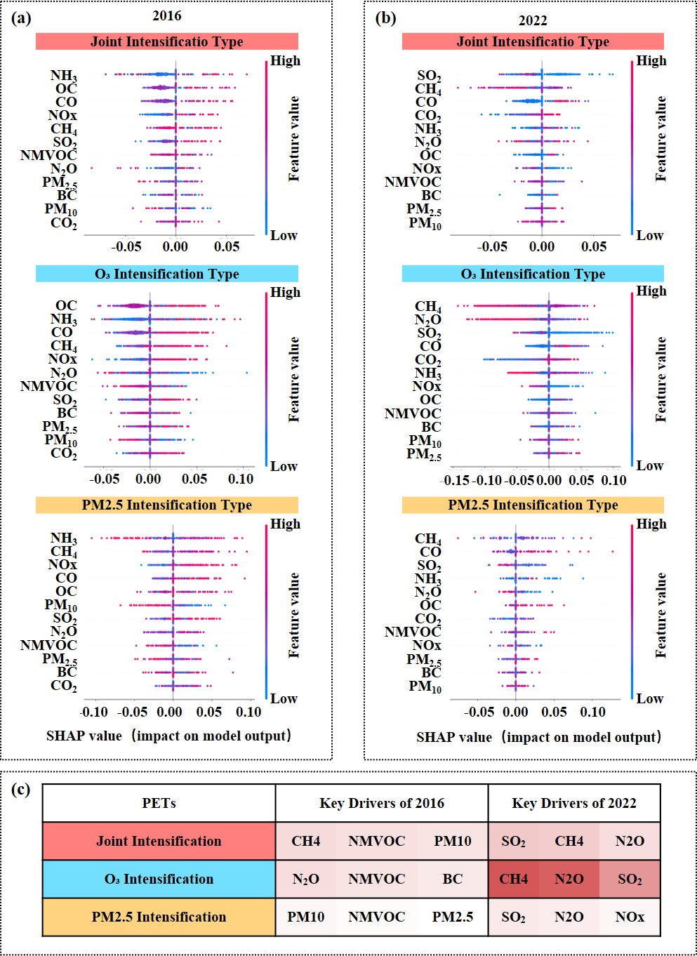 本研究利用2015年至2022年的年度数据,采用多种机器学习基学习器(如随机森林、XGBoost、SVM等)构建了高性能的预测框架,分类准确率达到92.63% 。研究发现:(1)中国大部分地区需要优先控制的排放因子已经发生变化。2015-2022年间,PM10和NMVOC等传统因子的减排边际效益减弱,而CH4、SO2、NOx和N2O正成为影响污染演化的核心目标,特别需要重视是温室气体CH4和N2O的重要性日益凸显 。(2)通过模型分类,清晰刻画了中国不同城市群的污染特征。不同污染演化类型地区的驱动因素不同。例如,在臭氧污染加剧型地区,精准管控VOCs和NOx的比例是关键;而在交通密集区,各类因子的排放仍呈上升趋势,需全面加强源头治理。(3)精准管控具有显著效益。模拟显示,若全国统一减排5%,可能导致臭氧反弹区域扩大超过15%;而根据本研究识别的SHAP优先级进行精准减排,则能大幅提升协同治理效益 。