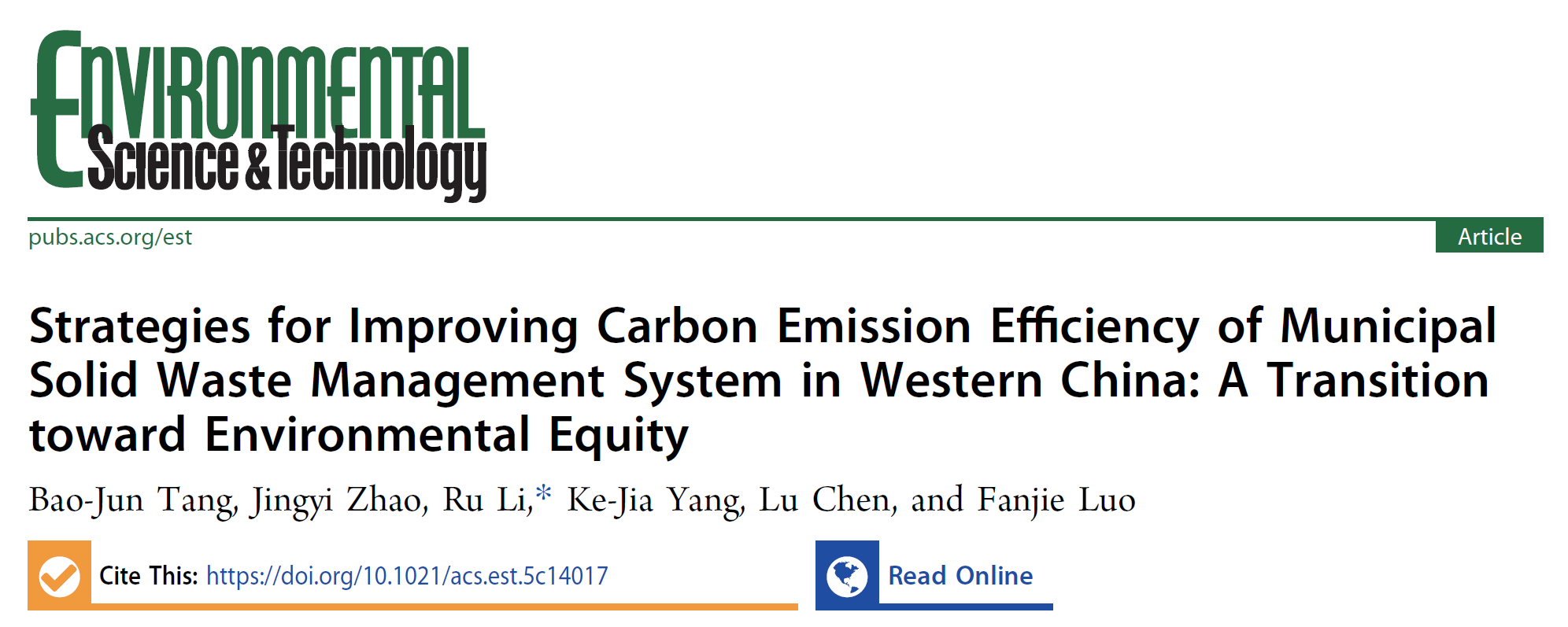 论文详情:Bao-Jun Tang; Jingyi Zhao; Ru Li*; Ke-Jia Yang; Lu Chen; Fanjie Luo, Strategies for improving carbon emission efficiency of municipal solid waste management system in western China: A transition toward environmental equity. Environmental Science & Technology (2026). DOI: 10.1021/acs.est.5c14017.